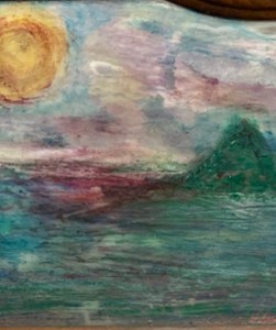 This painting represents my BVI sailing experience- with its green pyramidal hills and semi-submerged boulders, multi-colored waters ever changing from sunrise to sunset, and the peaceful sense of sailing along the rolling seas. I left a few small portions of the mirror exposed, to allow reflections to both generate movement and changing light, when installed on a wall.